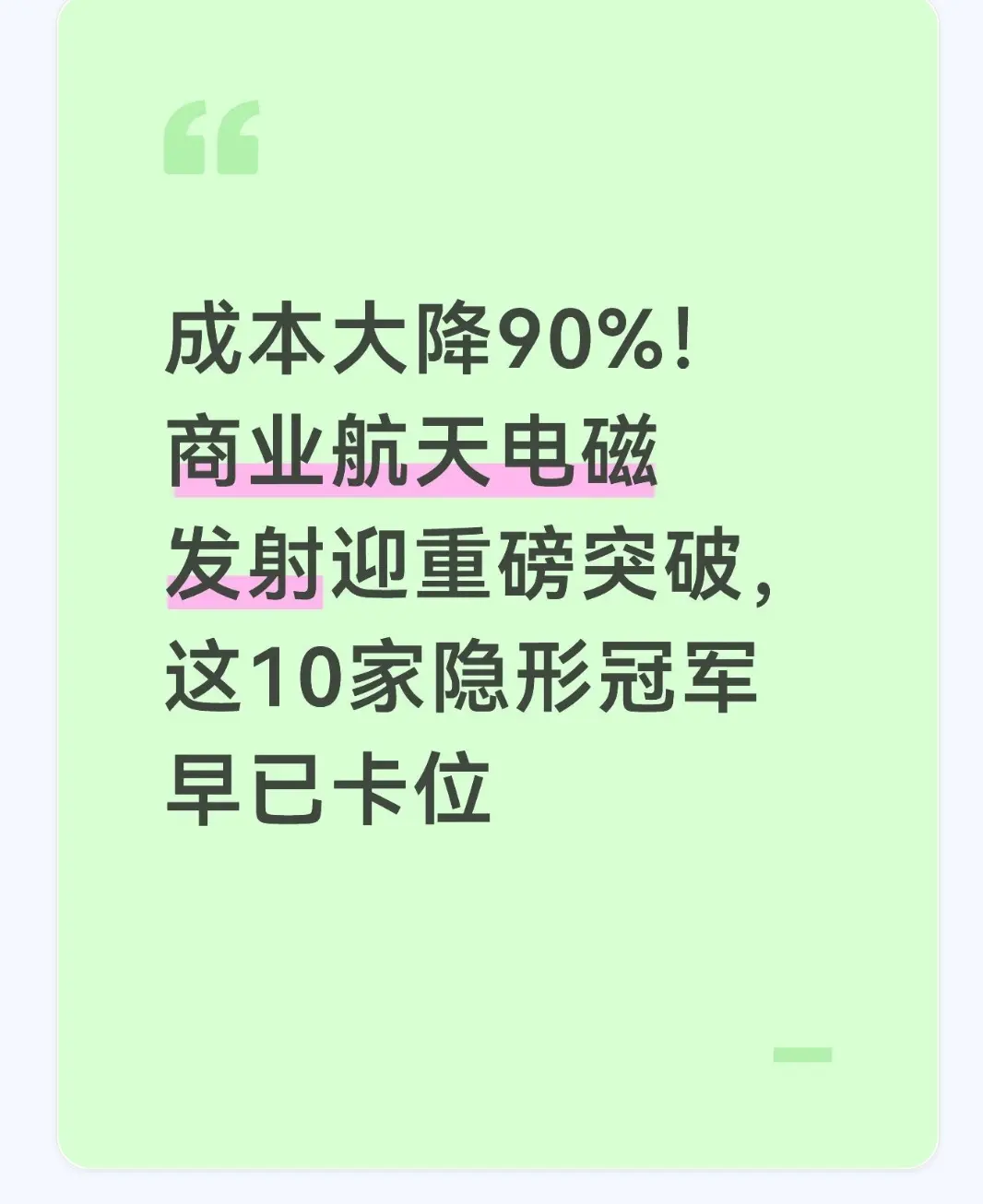 要知道,过去咱们不管是发射卫星还是运载火箭,靠的都是传统的化学燃料推进,不仅成本高得离谱,一枚小型运载火箭的发射成本动辄上亿,而且还受燃料储备、发射场地等各种条件限制。现在电磁发射技术的突破,相当于给商业航天装上了一台“超级加速器”,直接把行业的成本门槛给打了下来。今天咱们就掰开揉碎了聊聊这个技术到底牛在哪,还有哪些提前布局的企业,已经悄悄站在了这条新赛道的风口上。